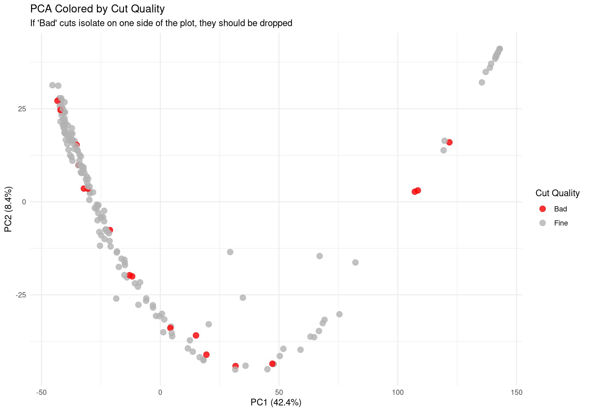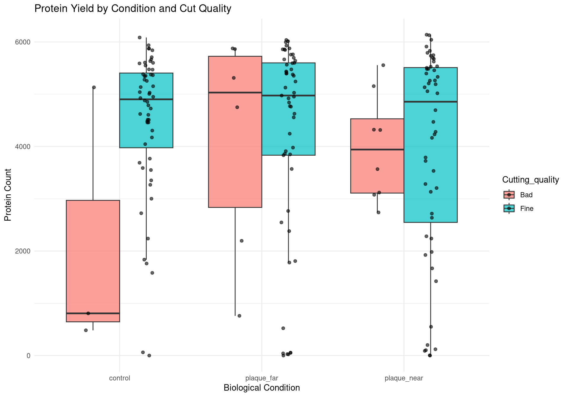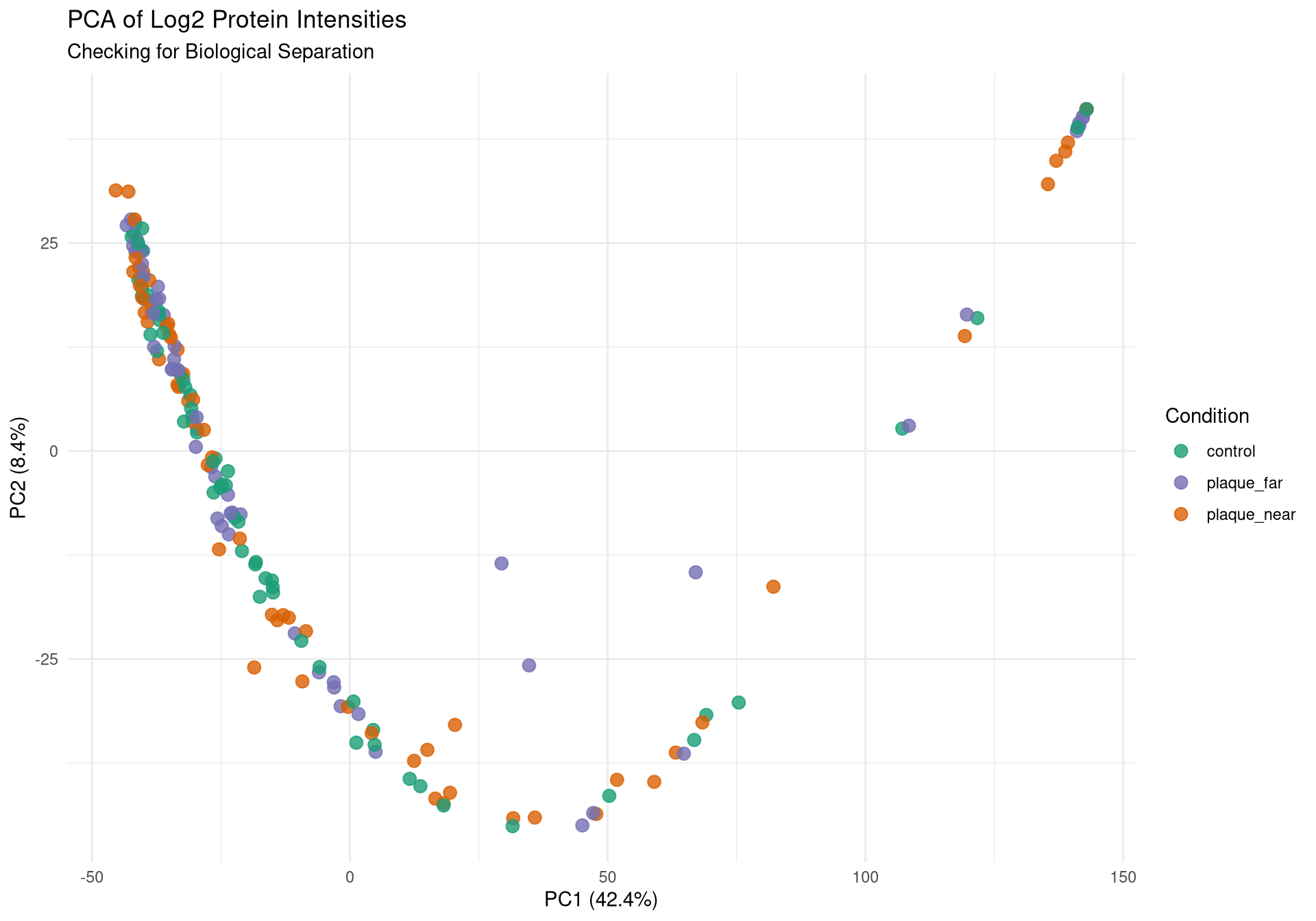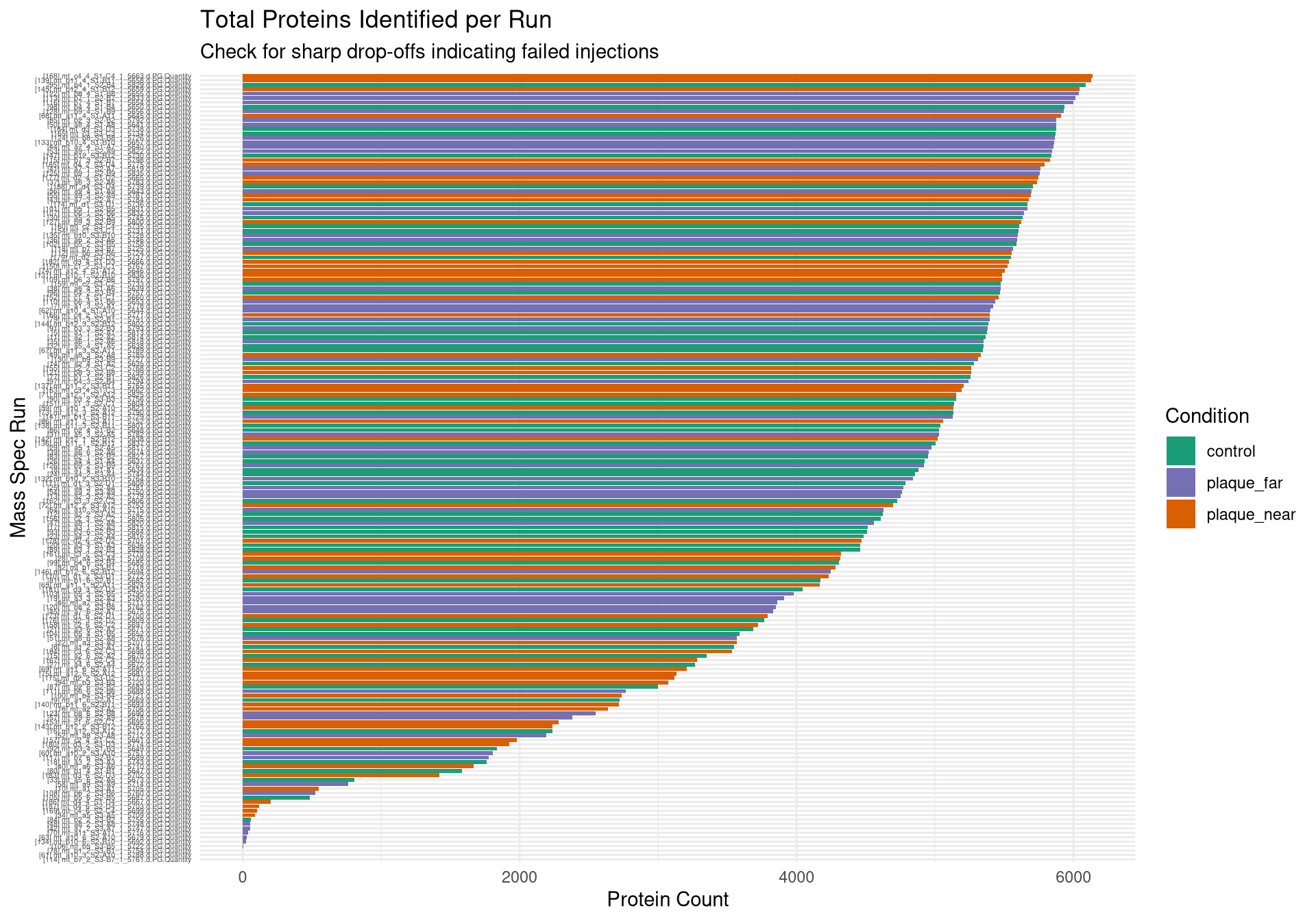 # ---------------------------------------------------------# Plot 1: Protein Count per Run# ---------------------------------------------------------p1 <-ggplot(qc_data, aes(x =reorder(Run, Protein_Count), y = Protein_Count, fill = Condition)) +geom_bar(stat ="identity") +theme_minimal() +coord_flip() +scale_fill_manual(values =c("control"="#1b9e77", "plaque_near"="#d95f02", "plaque_far"="#7570b3")) +labs(title ="Total Proteins Identified per Run",subtitle ="Check for sharp drop-offs indicating failed injections",x ="Mass Spec Run", y ="Protein Count") +theme(axis.text.y =element_text(size =4)) # ---------------------------------------------------------# Plot 2: Yield by Condition & Cutting Quality# ---------------------------------------------------------p2 <-ggplot(qc_data, aes(x = Condition, y = Protein_Count, fill = Cutting_quality)) +geom_boxplot(outlier.shape =NA, alpha =0.7, position =position_dodge(width =0.75)) +geom_point(position =position_jitterdodge(jitter.width =0.2, dodge.width =0.75), alpha =0.6, size =1.5) +theme_minimal() +labs(title ="Protein Yield by Condition and Cut Quality",x ="Biological Condition", y ="Protein Count")# ---------------------------------------------------------# Plot 3: PCA (Color by Condition)# ---------------------------------------------------------p3 <-ggplot(pca_df, aes(x = PC1, y = PC2, color = Condition)) +geom_point(size =3, alpha =0.8) +theme_minimal() +scale_color_manual(values =c("control"="#1b9e77", "plaque_near"="#d95f02", "plaque_far"="#7570b3")) +labs(title ="PCA of Log2 Protein Intensities",subtitle ="Checking for Biological Separation",x =paste0("PC1 (", variance_explained[1], "%)"),y =paste0("PC2 (", variance_explained[2], "%)")) +theme(legend.position ="right")# ---------------------------------------------------------# Plot 4: PCA (Color by Cutting Quality) <--- NEW PLOT# ---------------------------------------------------------p4 <-ggplot(pca_df, aes(x = PC1, y = PC2, color = Cutting_quality)) +geom_point(size =3, alpha =0.8) +theme_minimal() +# Using distinct colors so it's easy to spot the "Bad" onesscale_color_manual(values =c("Fine"="gray70", "Bad"="red")) +labs(title ="PCA Colored by Cut Quality",subtitle ="If 'Bad' cuts isolate on one side of the plot, they should be dropped",x =paste0("PC1 (", variance_explained[1], "%)"),y =paste0("PC2 (", variance_explained[2], "%)"),color ="Cut Quality") +theme(legend.position ="right")# ---------------------------------------------------------# Plot 5: PCA (Color by Batch)# ---------------------------------------------------------p5 <-ggplot(pca_df, aes(x = PC1, y = PC2, color =as.factor(Batch))) +geom_point(size =3, alpha =0.8) +theme_minimal() +labs(title ="PCA Colored by Mass Spec Batch",subtitle ="If colors cluster perfectly, we have a Batch Effect",x =paste0("PC1 (", variance_explained[1], "%)"),y =paste0("PC2 (", variance_explained[2], "%)"),color ="Batch")# ---------------------------------------------------------# 2. Save to PDF (The background export)# ---------------------------------------------------------pdf_path <-file.path(results_dir, "Initial_QC_Report.pdf")cat("Generating PDF report at:", pdf_path, "\n")