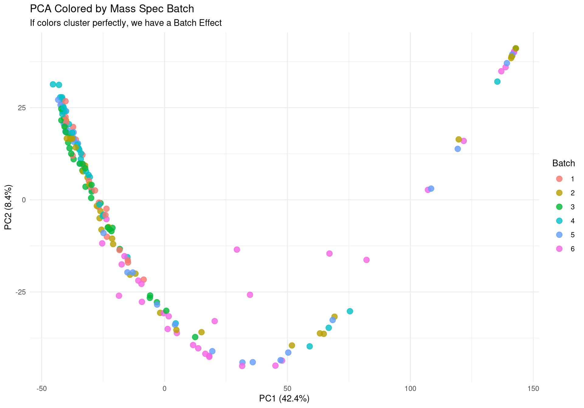 # Convert the subsetted data to a numeric matrixpca_matrix <-as.matrix(quant_data)# Log2 transform the intensities (adding +1 to avoid log2(0))pca_matrix_log <-log2(pca_matrix +1)# Transpose it so Rows = Runs, Columns = Proteins (prcomp expects this)pca_matrix_log_t <-t(pca_matrix_log)# 1. IMPUTE FIRST: Fill missing values (NAs or 0s) with a tiny noise floornoise_floor <-min(pca_matrix_log_t[pca_matrix_log_t >0], na.rm =TRUE) /2pca_matrix_log_t[is.na(pca_matrix_log_t) | pca_matrix_log_t ==0] <- noise_floor# 2. FILTER SECOND: Now remove any proteins that have zero variance # (e.g., proteins that were all NAs and are now just a flat line of noise_floor)valid_cols <-apply(pca_matrix_log_t, 2, var) >0pca_matrix_log_t <- pca_matrix_log_t[, valid_cols]cat("Running prcomp...\n")
