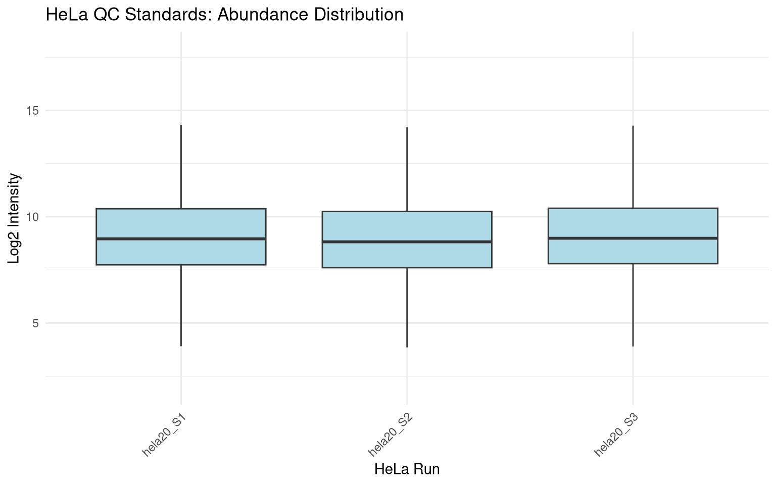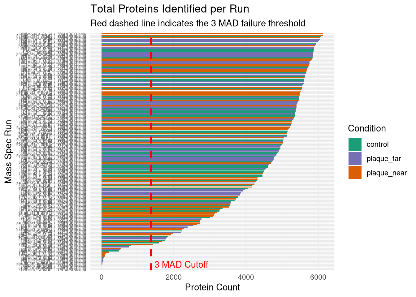 # Identify the exact runs that failedfailed_runs <- qc_data %>%filter(Protein_Count < mad_cutoff) %>%pull(Run)if(length(failed_runs) >0) {cat("\nWARNING: Found", length(failed_runs), "failed runs to drop:\n")print(failed_runs)} else {cat("\nExcellent: No runs fell below the 3 MAD threshold!\n")}
