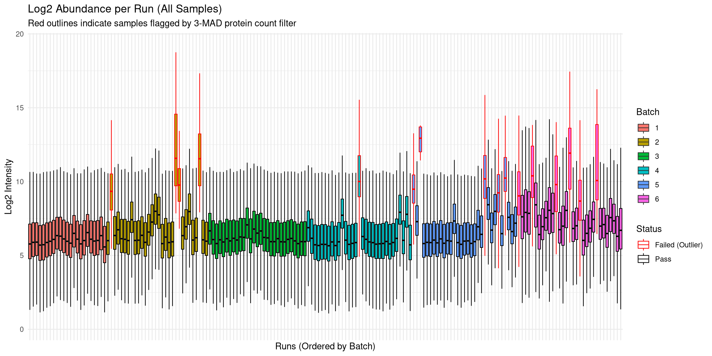 # Prepare full quantitative datafull_quant_log <-log2(as.matrix(quant_data) +1)full_quant_log[full_quant_log ==0] <-NA# Merge with metadata and flag failures for the plotabund_full <-as.data.frame(full_quant_log) %>%mutate(Protein =row_number()) %>%pivot_longer(-Protein, names_to ="Run", values_to ="Log2_Intensity") %>%drop_na() %>%left_join(qc_data, by ="Run") %>%mutate(Status =ifelse(Run %in% failed_runs, "Failed (Outlier)", "Pass"))p_abund <-ggplot(abund_full, aes(x =reorder(Run, Batch), y = Log2_Intensity, fill =as.factor(Batch))) +geom_boxplot(aes(color = Status), outlier.shape =NA, lwd =0.4) +scale_color_manual(values =c("Pass"="black", "Failed (Outlier)"="red")) +theme_minimal() +labs(title ="Log2 Abundance per Run (All Samples)",subtitle ="Red outlines indicate samples flagged by 3-MAD protein count filter",x ="Runs (Ordered by Batch)", y ="Log2 Intensity", fill ="Batch") +theme(axis.text.x =element_blank())print(p_abund)