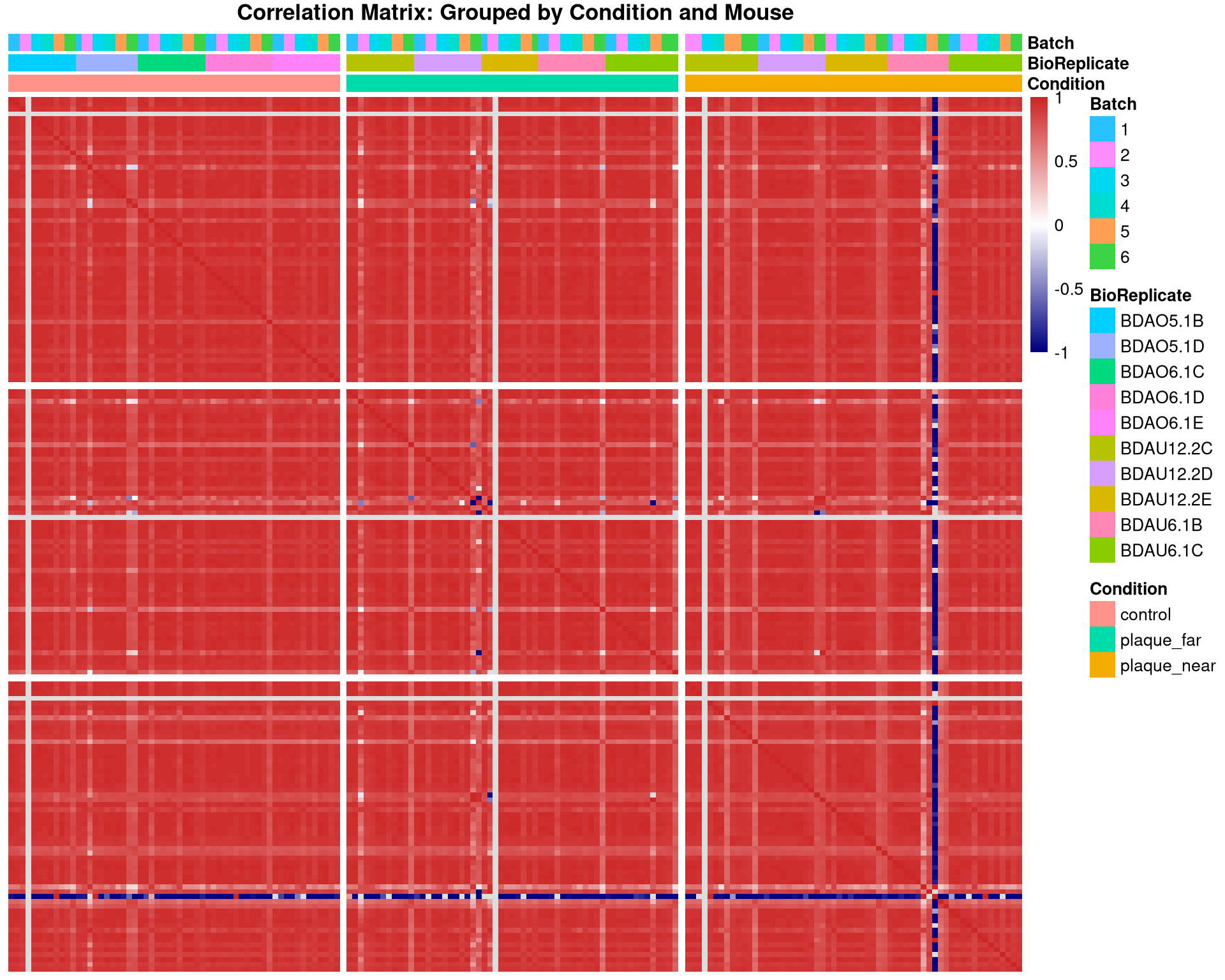 #log2 transform matrix of intensities as pearson works best on log scalequant_mat_log <-log2(as.matrix(quant_data) +1)quant_mat_log[quant_mat_log ==0] <-NA#ensure zeroes don't artificially boost correlation#create correlation matrixcor_mat <-cor(quant_mat_log, use ="pairwise.complete.obs")# prepare the sorted metadata# creating order for axesmeta_sorted <- meta_mapped %>%arrange(Condition, BioReplicate, Batch) %>%as.data.frame()#Reorder the correlation matrix to match this biological order# Run as indexsorted_runs <- meta_sorted$Runcor_mat_sorted <- cor_mat[sorted_runs, sorted_runs]#setup the annotation dataframeanno_df <- meta_sorted %>%select(Run, Condition, BioReplicate, Batch) %>%mutate(Batch =as.factor(Batch)) %>%as.data.frame()rownames(anno_df) <- anno_df$Runanno_df$Run <-NULL#Plot the Heatmappheatmap(cor_mat_sorted, main ="Correlation Matrix: Grouped by Condition and Mouse",annotation_col = anno_df,cluster_rows =FALSE, # DO NOT cluster - keep our manual ordercluster_cols =FALSE, # DO NOT cluster - keep our manual ordershow_rownames =FALSE, show_colnames =FALSE,color =colorRampPalette(c("navy", "white", "firebrick3"))(100),# Add gaps to visually separate the Conditionsgaps_col =which(diff(as.numeric(as.factor(meta_sorted$Condition))) !=0),gaps_row =which(diff(as.numeric(as.factor(meta_sorted$Condition))) !=0))