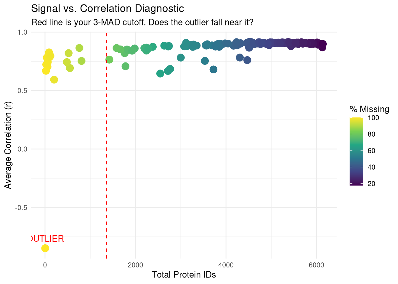 # 4. Visualize the relationshipp_diag <-ggplot(qc_diagnostics, aes(x = Protein_Count, y = Avg_Correlation)) +geom_point(aes(color = NA_Percent), size =4) +geom_vline(xintercept = mad_cutoff, linetype ="dashed", color ="red") +geom_text(aes(label =ifelse(Run == outlier_id, "OUTLIER", "")), vjust =-1, color ="red") +scale_color_viridis_c(name ="% Missing") +theme_minimal() +labs(title ="Signal vs. Correlation Diagnostic",subtitle ="Red line is your 3-MAD cutoff. Does the outlier fall near it?",x ="Total Protein IDs", y ="Average Correlation (r)")print(p_diag)