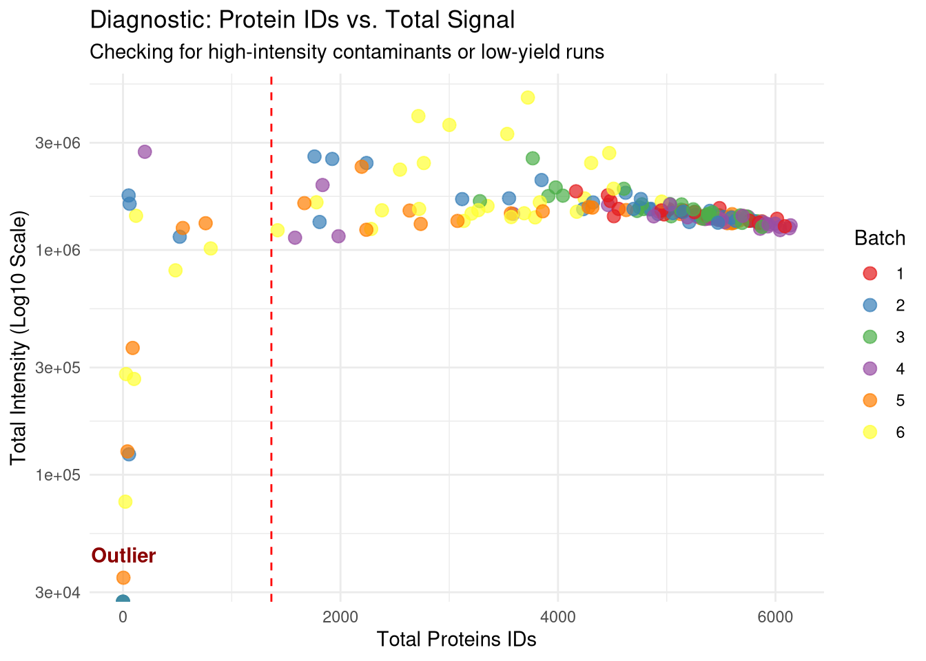 # 1. Calculate Total Raw Intensity per Run# We use the raw quant_data (pre-log) to see the physical signal magnitudetotal_intensities <-colSums(quant_data, na.rm =TRUE)# 2. Add Total_Intensity to your existing qc_data# Match the names of the colSums output to the Run column in qc_dataqc_data[, Total_Intensity := total_intensities[Run]]# 3. Create the Diagnostic Plotp_intensity_vs_count <-ggplot(qc_data, aes(x = Protein_Count, y = Total_Intensity)) +# Use log10 scale for Y if intensities vary by orders of magnitudescale_y_log10() +geom_point(aes(color =as.factor(Batch)), size =3, alpha =0.7) +# Add the 3-MAD failure line for contextgeom_vline(xintercept = mad_cutoff, linetype ="dashed", color ="red") +# Label the outlier specificallygeom_text(aes(label =ifelse(Run == outlier_id, "Outlier", "")), vjust =-1, color ="darkred", fontface ="bold") +theme_minimal() +scale_color_brewer(palette ="Set1") +labs(title ="Diagnostic: Protein IDs vs. Total Signal",subtitle ="Checking for high-intensity contaminants or low-yield runs",x ="Total Proteins IDs",y ="Total Intensity (Log10 Scale)",color ="Batch")print(p_intensity_vs_count)