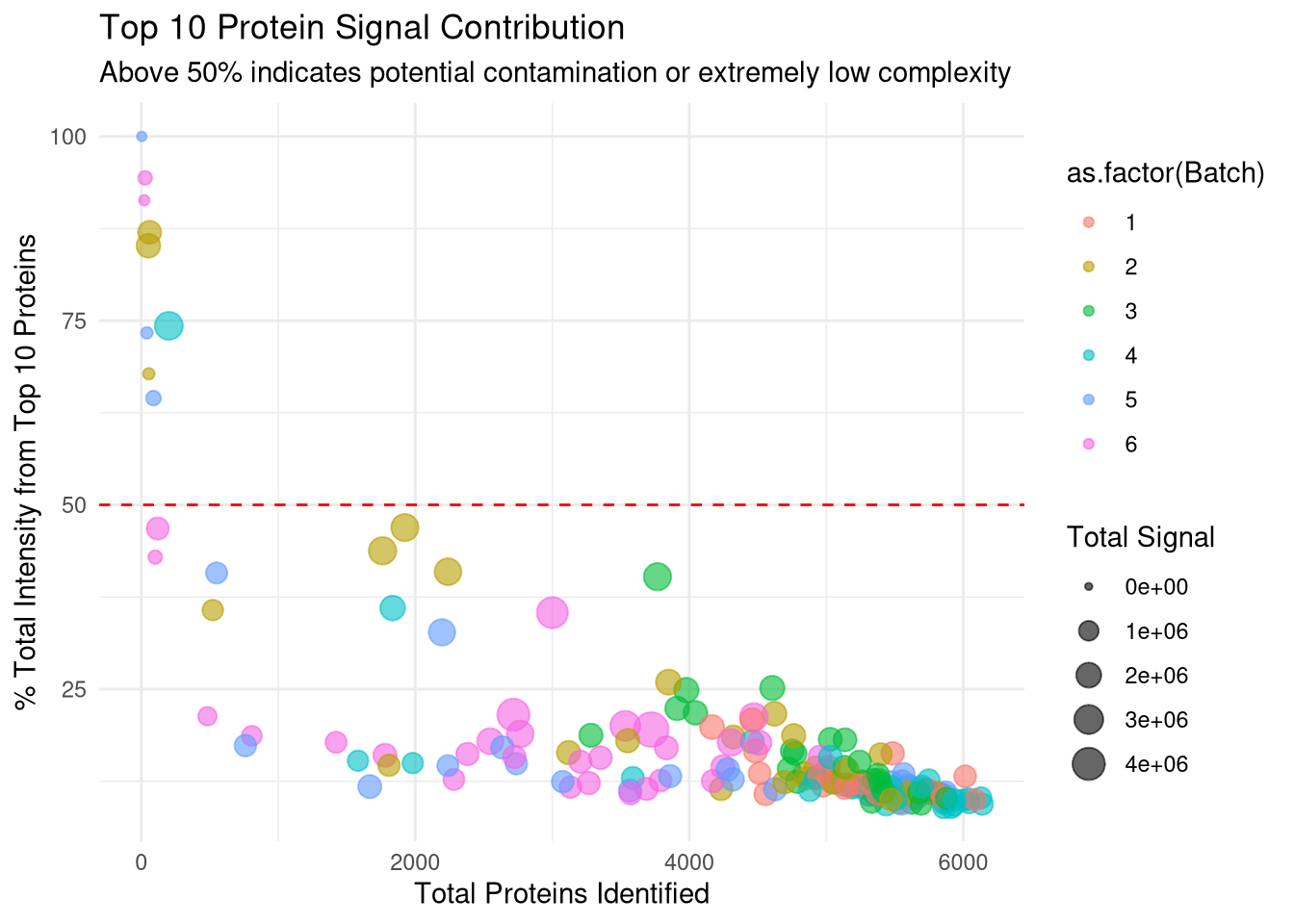 p_top10 <-ggplot(qc_data, aes(x = Protein_Count, y = Top10_Percent)) +geom_point(aes(color =as.factor(Batch), size = Total_Intensity), alpha =0.6) +geom_hline(yintercept =50, linetype ="dashed", color ="red") +# Label samples that cross the 50% thresholdgeom_text(aes(label =ifelse(Top10_Percent >50, Run, "")), vjust =-1, size =3, check_overlap =TRUE) +theme_minimal() +labs(title ="Top 10 Protein Signal Contribution",subtitle ="Above 50% indicates potential contamination or extremely low complexity",x ="Total Proteins Identified",y ="% Total Intensity from Top 10 Proteins",size ="Total Signal")print(p_top10)