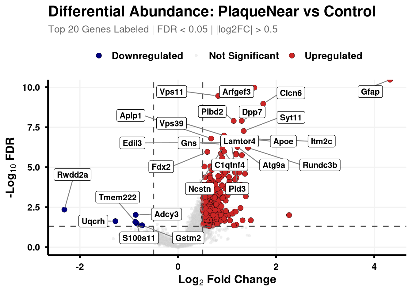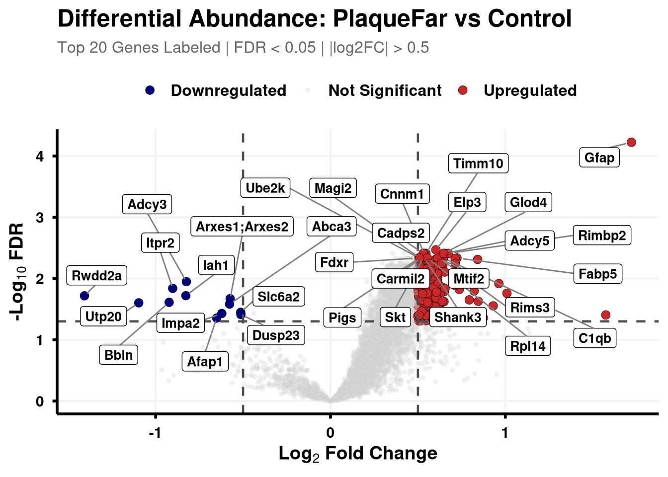 # Define coloursvolcano_cols <-c("Upregulated"="firebrick3", "Downregulated"="navy", "Not Significant"="grey80")generate_swanky_volcano <-function(msstats_results, dict, comparison_label, logfc_cutoff =0.5, graphs_dir ="results") {# --- Data Processing --- volcano_data <- msstats_results %>%# Isolate the specific comparison and drop missing valuesfilter(Label == comparison_label, !is.na(adj.pvalue), is.finite(log2FC)) %>%# Map the Gene names from the dictionaryleft_join(dict, by ="Protein") %>%mutate(# Fallback to Protein ID if Gene name is missingGene =ifelse(is.na(Gene) | Gene =="", Protein, Gene),# Define significance categoriesStatus =case_when( adj.pvalue <0.05& log2FC > logfc_cutoff ~"Upregulated", adj.pvalue <0.05& log2FC <-logfc_cutoff ~"Downregulated",TRUE~"Not Significant" ) ) %>%# Group by Status to rank Upregulated and Downregulated separatelygroup_by(Status) %>%# Rank by FDR (smallest adj.pvalue = 1)mutate(GroupRank =rank(adj.pvalue, ties.method ="first")) %>%ungroup() %>%mutate(# Label top 20 for each significant categoryPlotLabel =case_when( Status !="Not Significant"& GroupRank <=20~ Gene, TRUE~NA_character_ ) )# --- Plotting --- p <-ggplot(volcano_data, aes(x = log2FC, y =-log10(adj.pvalue), fill = Status, color = Status)) +geom_point(aes(size = Status, alpha = Status), shape =21, stroke =0.2) +scale_fill_manual(values = volcano_cols) +scale_color_manual(values =c("Upregulated"="black", "Downregulated"="black", "Not Significant"="grey90")) +scale_size_manual(values =c("Upregulated"=3, "Downregulated"=3, "Not Significant"=1.5)) +scale_alpha_manual(values =c("Upregulated"=1, "Downregulated"=1, "Not Significant"=0.3)) +geom_hline(yintercept =-log10(0.05), linetype ="dashed", color ="grey30", linewidth =0.8) +geom_vline(xintercept =c(-logfc_cutoff, logfc_cutoff), linetype ="dashed", color ="grey30", linewidth =0.8) +geom_label_repel(aes(label = PlotLabel),fill ="white", color ="black", fontface ="bold", size =3.5,box.padding =0.5, point.padding =0.5,min.segment.length =0, segment.color ="grey50", max.overlaps =50 ) +labs(title =paste0("Differential Abundance: ", gsub("_", " ", comparison_label)),subtitle =paste0("Top 20 Genes Labeled | FDR < 0.05 | |log2FC| > ", logfc_cutoff),x =bquote(bold("Log"[2] ~"Fold Change")),y =bquote(bold("-Log"[10] ~"FDR")) ) +theme_minimal(base_size =14) +theme(plot.title =element_text(face ="bold", size =18, hjust =0),plot.subtitle =element_text(size =12, color ="grey40", margin =margin(b =10)),axis.title =element_text(face ="bold", size =14),axis.text =element_text(face ="bold", color ="black"),axis.line =element_line(color ="black", linewidth =1),axis.ticks =element_line(color ="black", linewidth =1),legend.position ="top",legend.title =element_blank(),legend.text =element_text(size =12, face ="bold"),panel.grid.minor =element_blank(),panel.grid.major =element_line(color ="grey95") )# --- Output Generation ---# Ensure directory existsdir.create(graphs_dir, showWarnings =FALSE, recursive =TRUE) safe_name <-gsub(" ", "_", comparison_label)# Save Plotggsave(filename =file.path(graphs_dir, paste0("Volcano_", safe_name, "_Swanky.pdf")), plot = p, width =10, height =7, dpi =300,device = cairo_pdf )# Save Data Table# Select only the most useful columns and sort by significance for easy reading export_data <- volcano_data %>% dplyr::select(Protein, Gene, Description, log2FC, pvalue, adj.pvalue, Status) %>%arrange(adj.pvalue)fwrite(export_data, file =file.path(graphs_dir, paste0("Volcano_Data_", safe_name, ".csv")))return(p)}