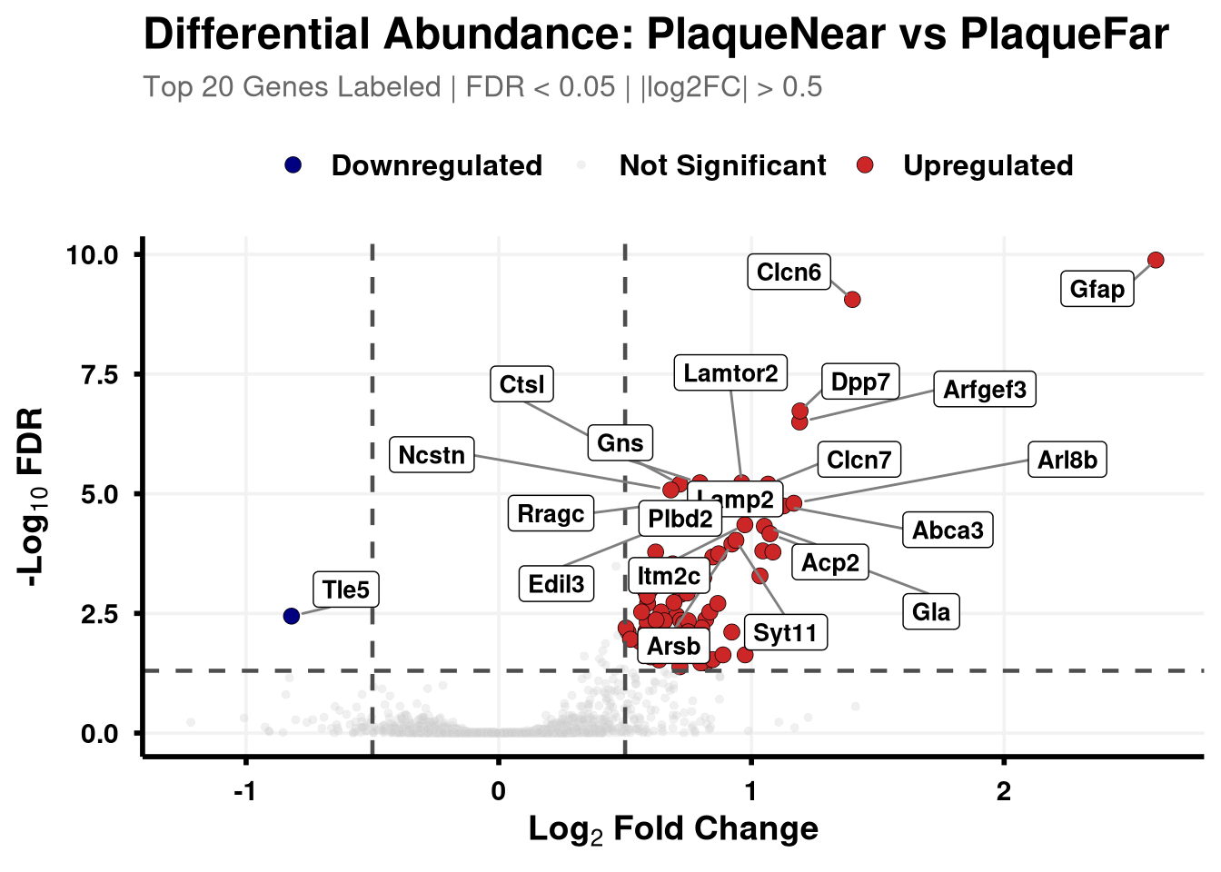 Interrogation of floor genes from Near vs Far plaque volcano plots