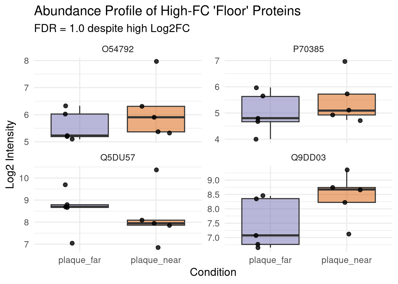 #filtered for top 4 logFC proteins with >0.99 FDRtarget_proteins <- res_df %>%filter(Label =="PlaqueNear_vs_PlaqueFar", adj.pvalue >0.99) %>%arrange(desc(abs(log2FC))) %>%slice_head(n =4) %>%pull(Protein)#read in msstats dataprocessed_data <-qs_read(file.path(objects_dir, "processed_msstats_data.qs2"))# extract their summarized abundances from the processed MSstats objectabundance_data <- processed_data$ProteinLevelData %>%filter(Protein %in% target_proteins) %>%# Filter to just the two conditions of interest for clarityfilter(GROUP %in%c("plaque_near", "plaque_far")) %>%group_by(Protein, GROUP, SUBJECT) %>%summarise(LogIntensities =mean(LogIntensities, na.rm =TRUE), .groups ="drop")#plot abundances#each dot represents the summarised abundance for a biological replicate p_abundance <-ggplot(abundance_data, aes(x = GROUP, y = LogIntensities, fill = GROUP)) +geom_boxplot(alpha =0.5, outlier.shape =NA) +geom_jitter(width =0.2, size =2, alpha =0.8) +facet_wrap(~ Protein, scales ="free_y") +theme_minimal(base_size =14) +scale_fill_manual(values =c("plaque_near"="#d95f02", "plaque_far"="#7570b3")) +labs(title ="Abundance Profile of High-FC 'Floor' Proteins",subtitle ="FDR = 1.0 despite high Log2FC",x ="Condition",y ="Log2 Intensity" ) +theme(legend.position ="none")# Print the plotprint(p_abundance)