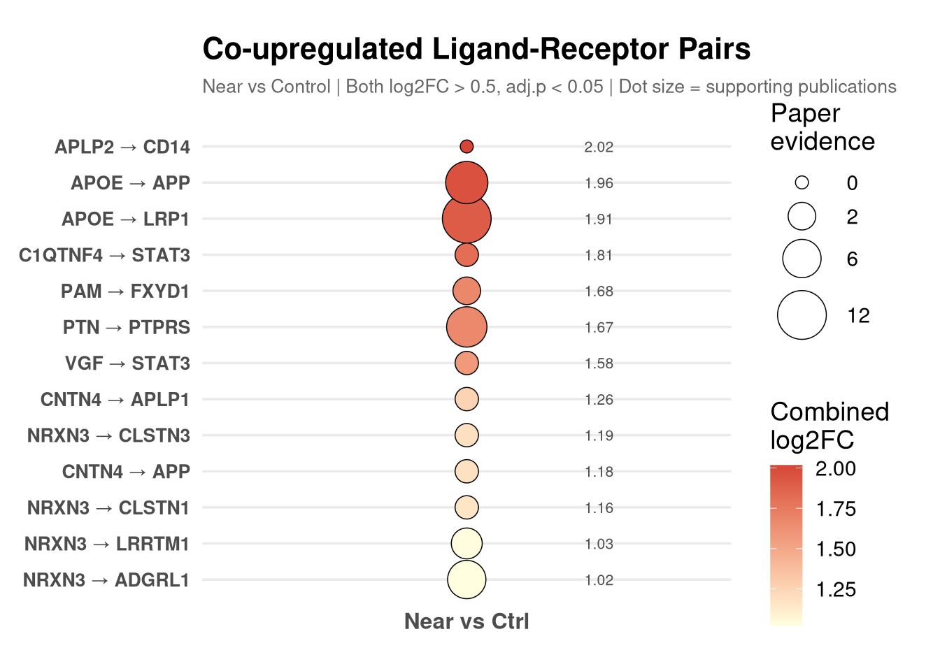 subtitle = "Near vs Control | Both log2FC > 0.5, adj.p < 0.05 | Dot size = supporting publications",