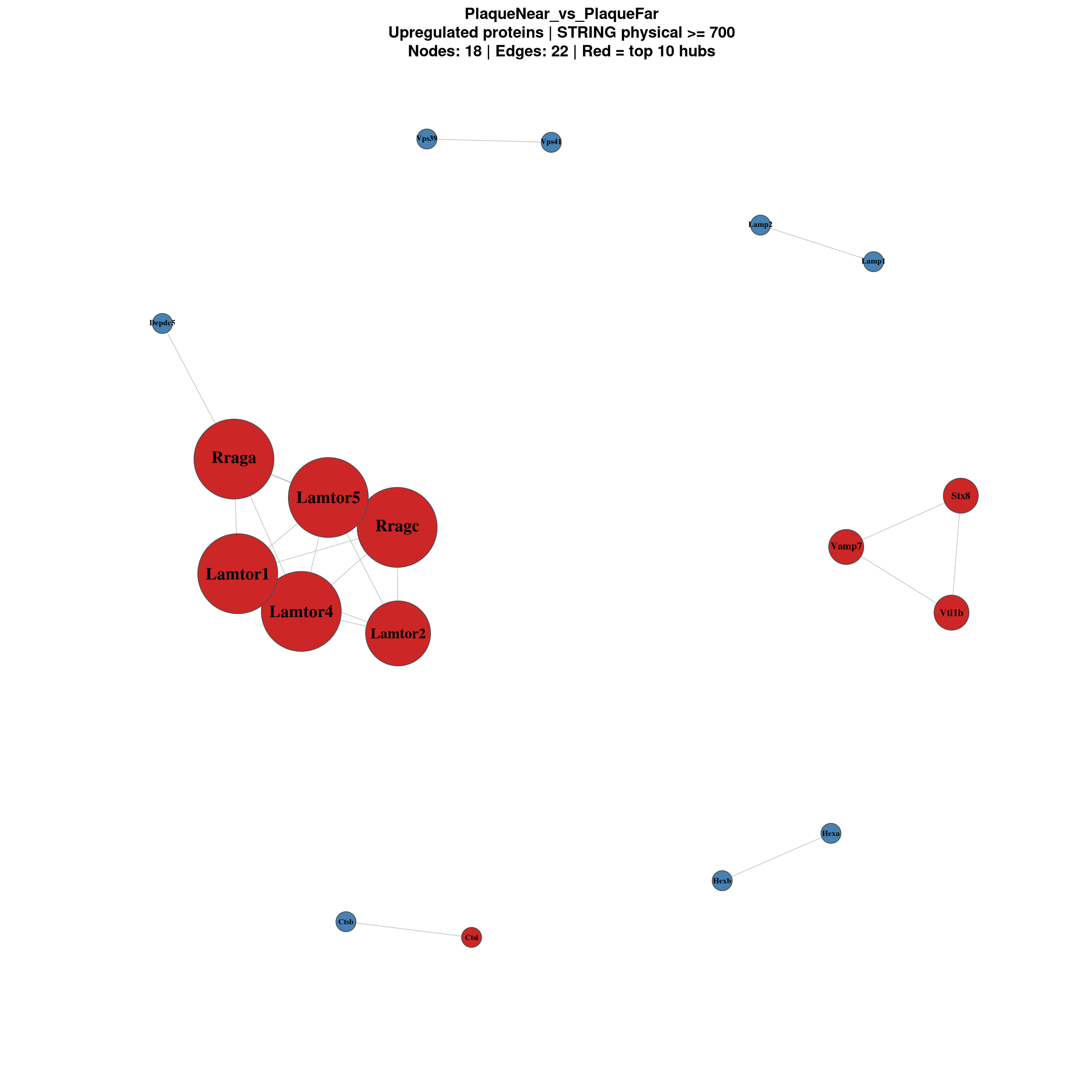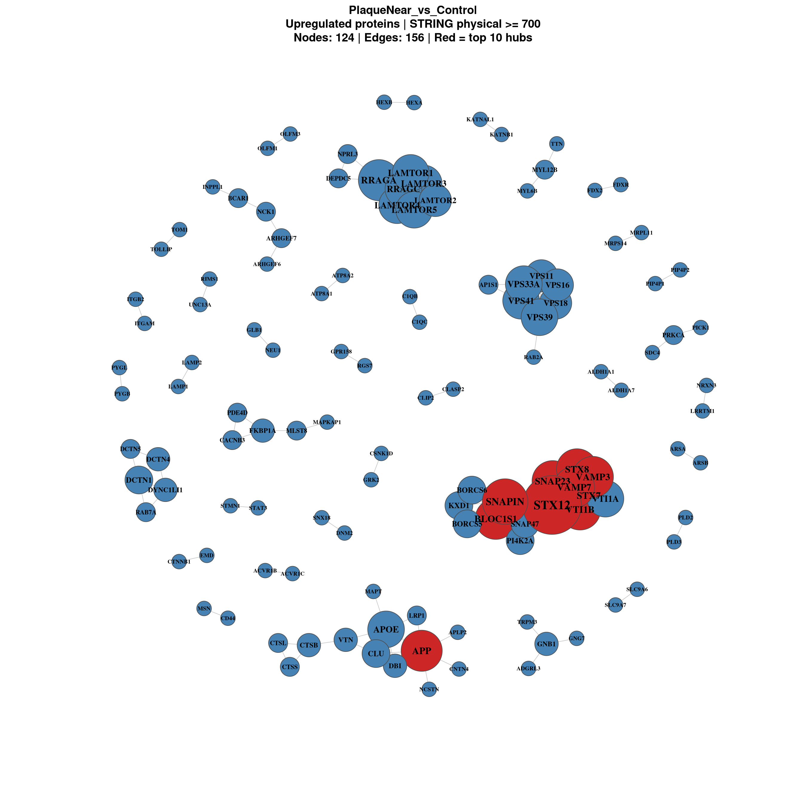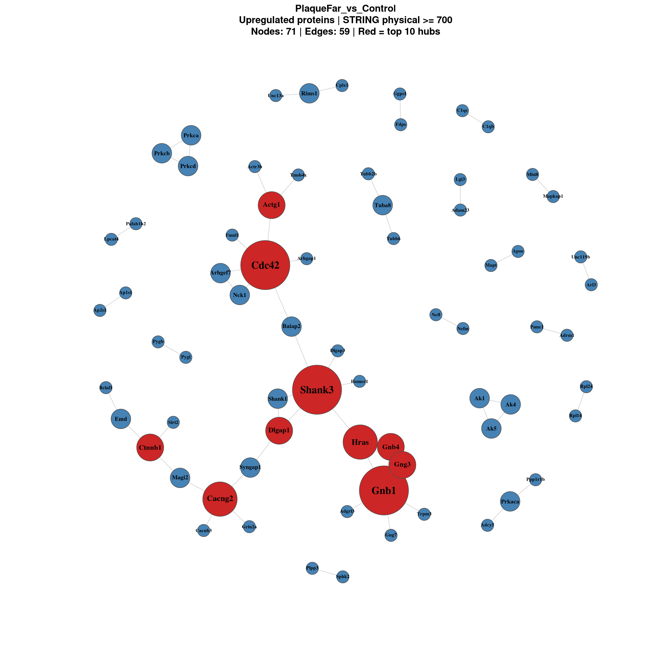 })This script identifies protein-protein interaction networks for upregulated proteins in each MSstats comparison using STRINGdb. It identifies hub proteins by degree centrality and exports summary tables for downstream interpretation.